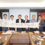 2016年10月25日——马中总商会李志贤副总会长(右三)赠送《光辉四十载》图片集予中国浙江舟山群岛新区金塘管理委员会副主任齐友国(左三)。左起为金塘镇人民政府镇长陈军和有关委员会综合行政执法局局长夏燕辉;右起为马中总商会交易考察委员会主席张联兴以及彭亨州分会会长拿督赵毓庭。