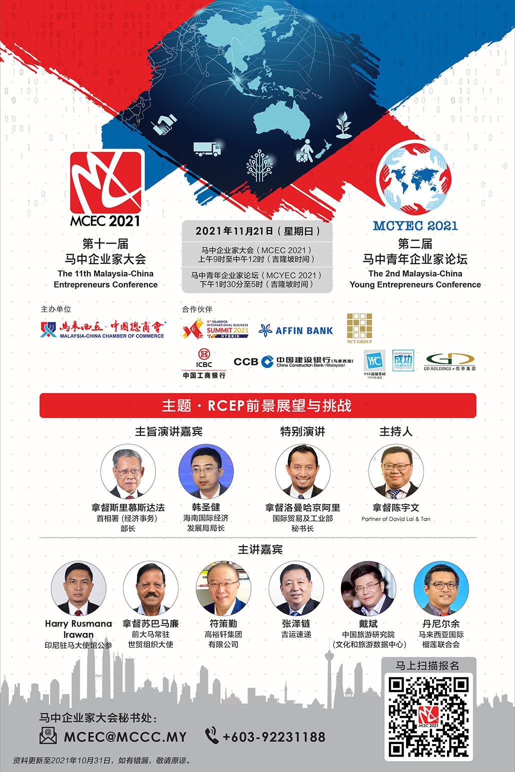 这项题为“RCEP前景展望及挑战”的马中企业家大会暨马中青年企业家论坛,为遵守疫情下的标准作业程序,大会现场仅限受邀嘉宾出席,大众可透过大会直播平台线上免费参会,观看政企菁英和与会者分享投资政策与优惠,以及他们的优质经验。