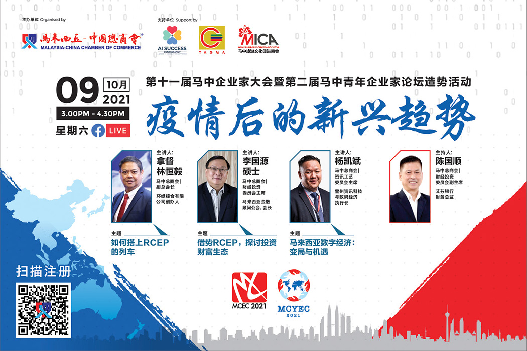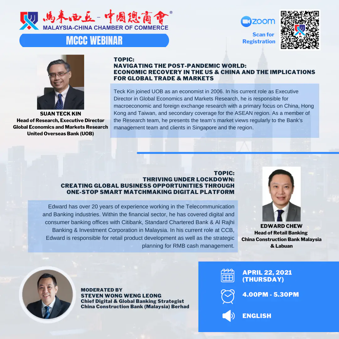 MCCC Webinar Date: 22 April 2021 (Thursday) Time: 4.00pm - 5.30pm Topic 1: Navigating the Post-Pandemic World: Economic Recovery in the US & China and The implications for Global Trade & Markets Speaker: SUAN TECK KIN, Head of Research, Executive Director, Global Economics and Markets Research, United Overseas Bank (UOB)…
