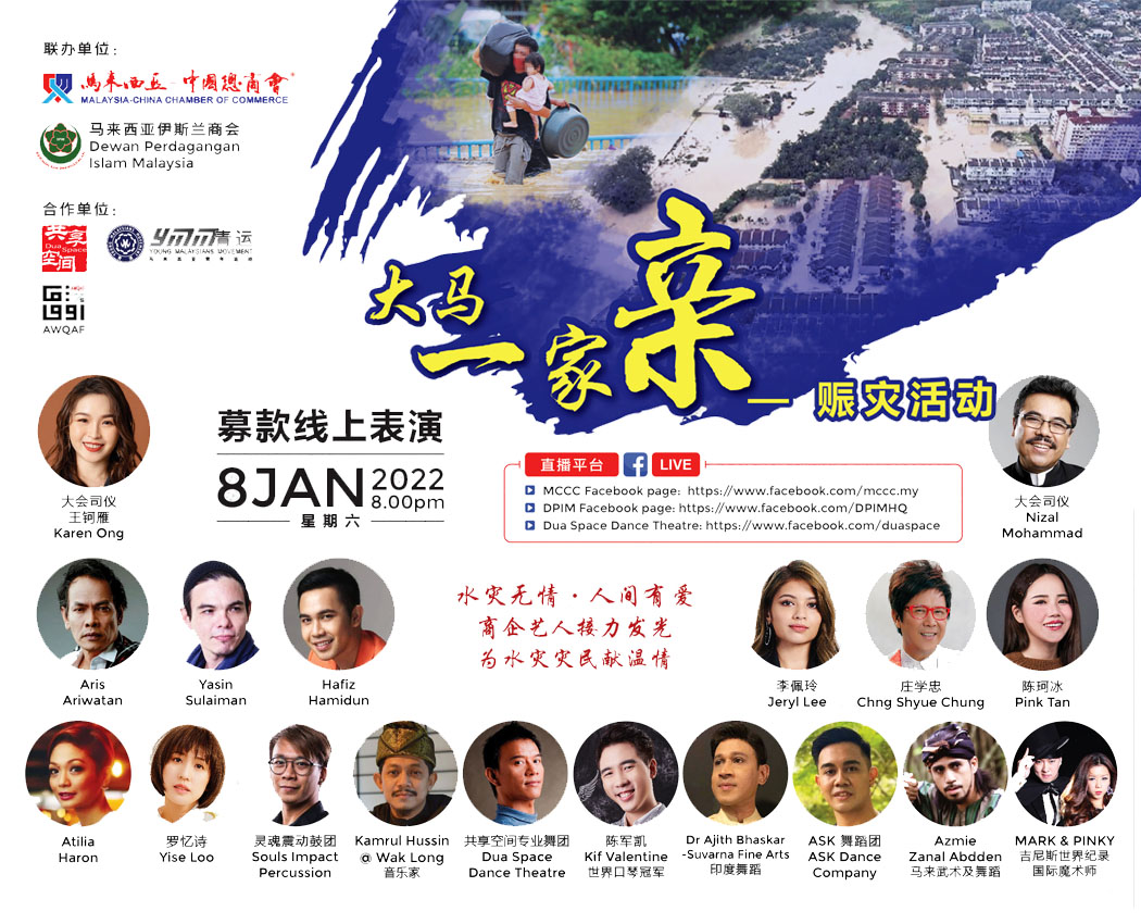 马中总商会与大马伊斯兰商会携手发动“大马一家亲”赈灾活动新闻稿 (吉隆坡29日讯) 水灾无情,人间有爱。马来西亚-中国总商会(MCCC)与马来西亚伊斯兰商会(DPIM)联合企业界、艺人与非政府组织接力发光,发动“大马一家亲”赈灾活动为水灾灾民献温情。 马来西亚遭严重洪水袭击,多个地区成重灾区,灾民顿时流离失所,损失惨重。马中总商会与大马伊斯兰商会因此联办“大马一家亲”赈灾活动,不分彼此地号召会员、企业家、公众人士捐献物资或款项,慷慨解囊。 其中,马中总商会女企业家委员会率先于两周前展开筹募物资活动,同时配合其他团体号召志工到彭亨文冬等重灾区协助灾民清理房子和派发物资。 此次活动的合作单位——马来西亚青年运动(青运)已号召150位志工,准备前往彭亨文德甲帮助当地灾民。 除了出力,马中总商会和大马伊斯兰商会也放眼筹募20万令吉,购买物资派发给灾民或协助他们添置所需物品和谋生工具。筹款活动启动的短短数日已成功筹获10万令吉。 另一方面,定于2022年1月8日直播的慈善义演也是“大马一家亲”赈灾活动的重点活动之一。马中总商会、大马伊斯兰商会与共享空间专业舞团创办人马金泉携手合作,邀艺人通过歌舞表演传达正能量,带给人们光明与希望。 各族艺人共襄盛举,充分体现大马一家亲的精神。参与艺人包括全职华人专业舞团共享空间与马来全职舞团Ask Dance Company呈献“携手一家人”舞蹈、Ajith舞蹈团呈献印度舞蹈、马来武术兼舞蹈家Azmie Bin Zanal Abdden、歌手庄学忠、罗忆诗、李佩玲、乐手灵魂震动鼓团、Mohd Yazid Kamarul、口琴冠军陈军凯、吉尼斯世界纪录国际魔术师 Mark & Pinky等。 有意捐款者,请将善款汇至马中总商会 Affin Bank 户头:Malaysia-China Chamber of Commerce(户头号码 1065 8001 3314),或大马伊斯兰商会 Muamalat 銀行户头:Dewan Perdagangan Islam Malaysia(户头号码 1401 0006 453710)。 至于捐赠物资者请于1月5日前,中午12时至傍晚5时将面食、饼干、床单、被单、毛毯、乳胶手套、水鞋、清扫用品等物资送到 IDC Training House Sdn Bhd,地址:No. 7, Unit 8, Jalan Industri PBP 3,…