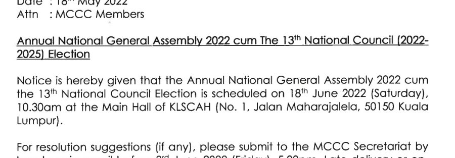 Notice is hereby given that the Annual National General Assembly 2022 cum the 13th National Council Election is scheduled on 18th June 2022 (Saturday), 10.30am at the Main Hall of KLSCAH (No. 1, Jalan Maharajalela, 50150 Kuala Lumpur).